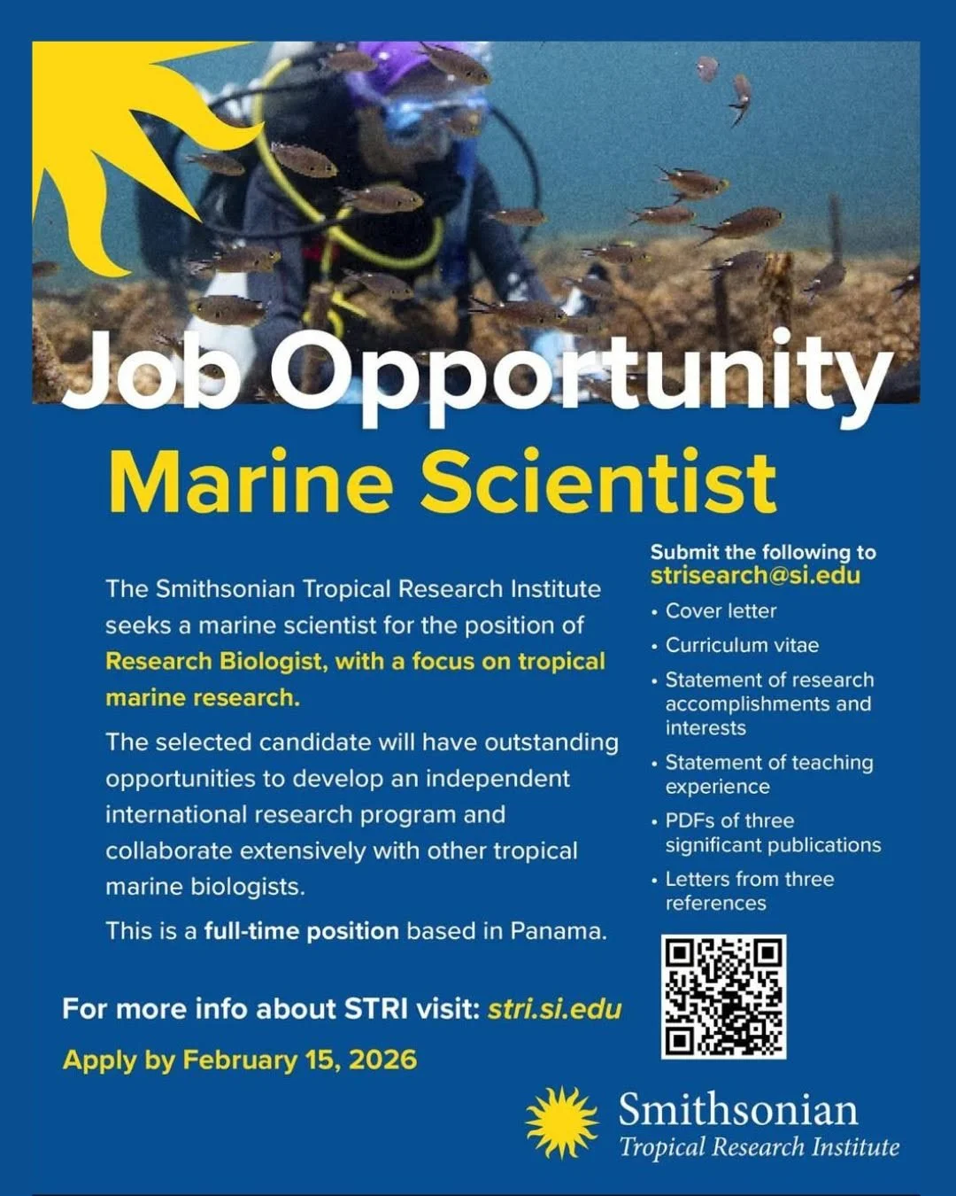STRI is hiring a staff scientist in marine science! This position is full-time research, tenured from the start, permanent, open to any nationality, and based in Panama. Within marine science, the focus is open-ended. Applicants in all marine fields are encouraged to apply. This includes marine behavioral ecology, sensory biology, bioacoustics, movement ecology. Deadline is Feb 15, 2026